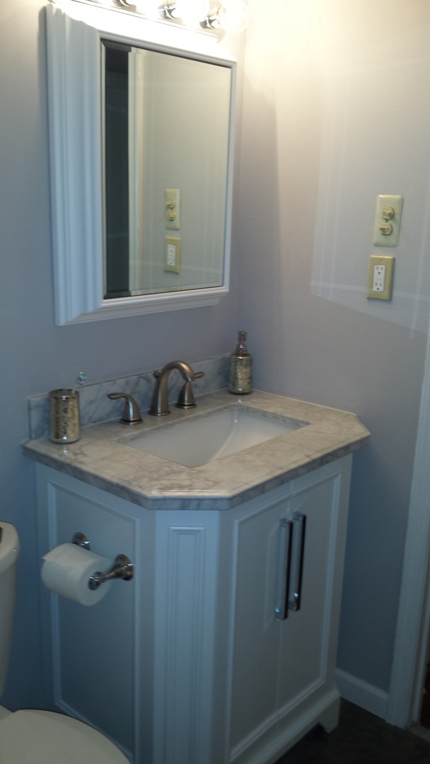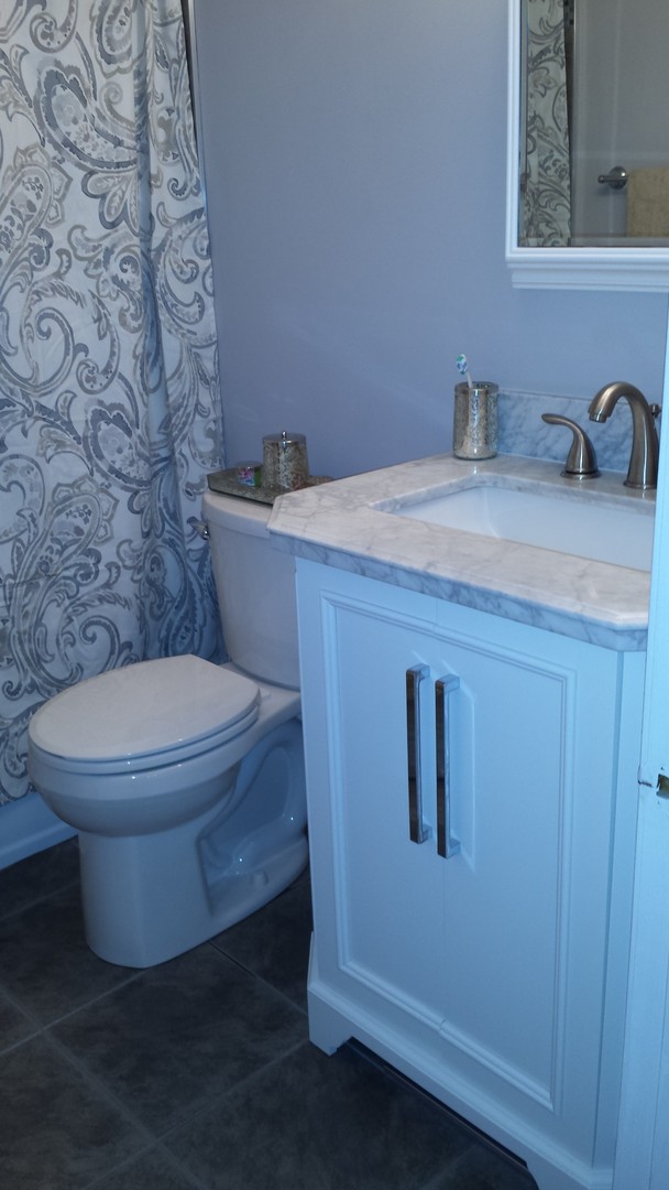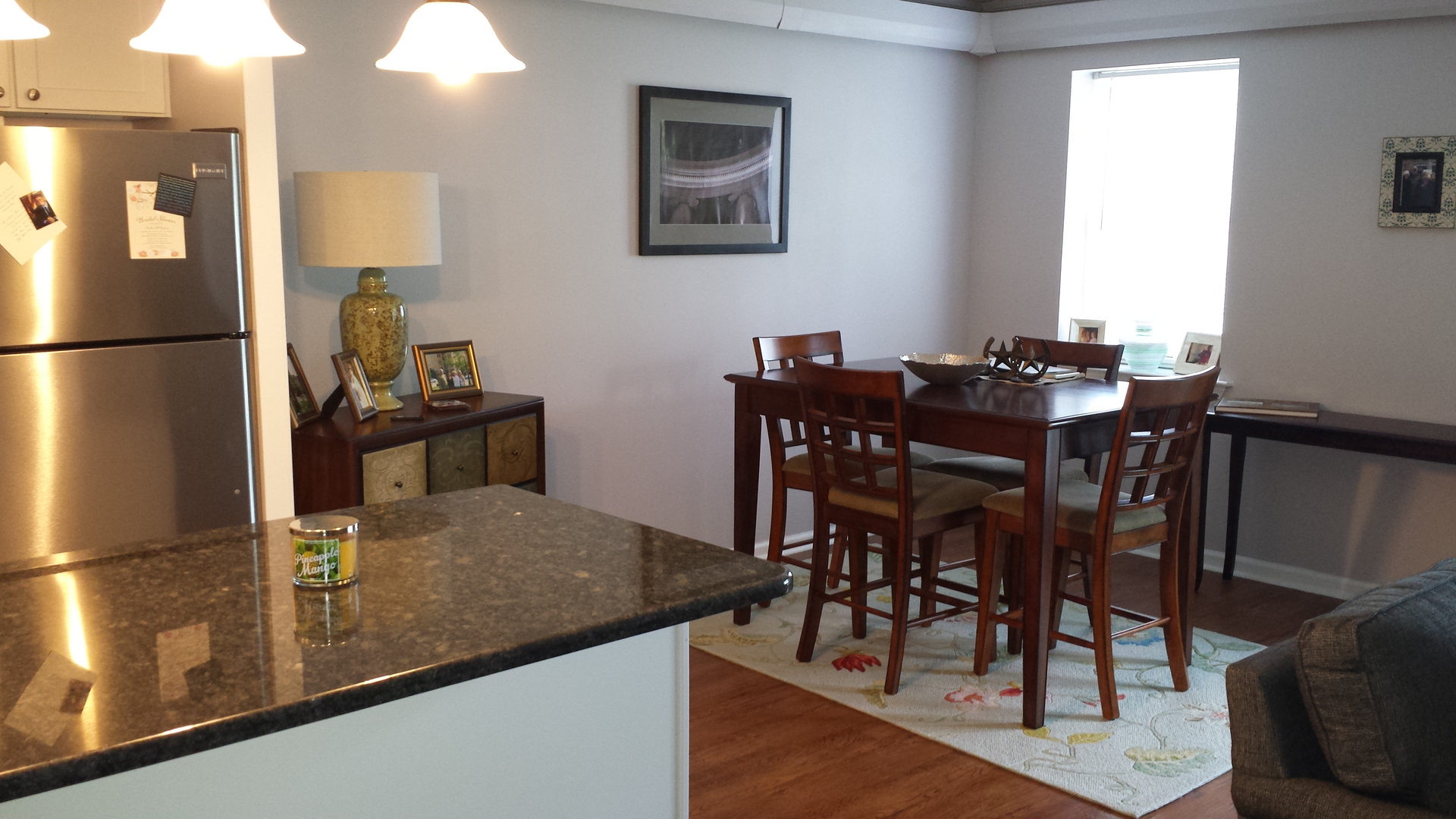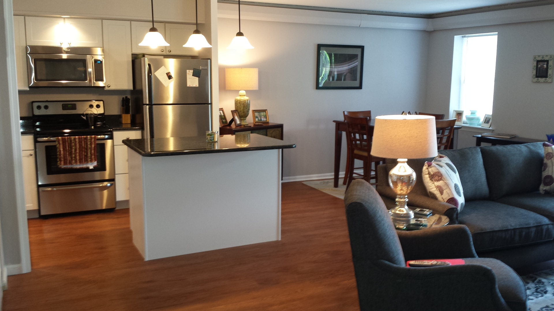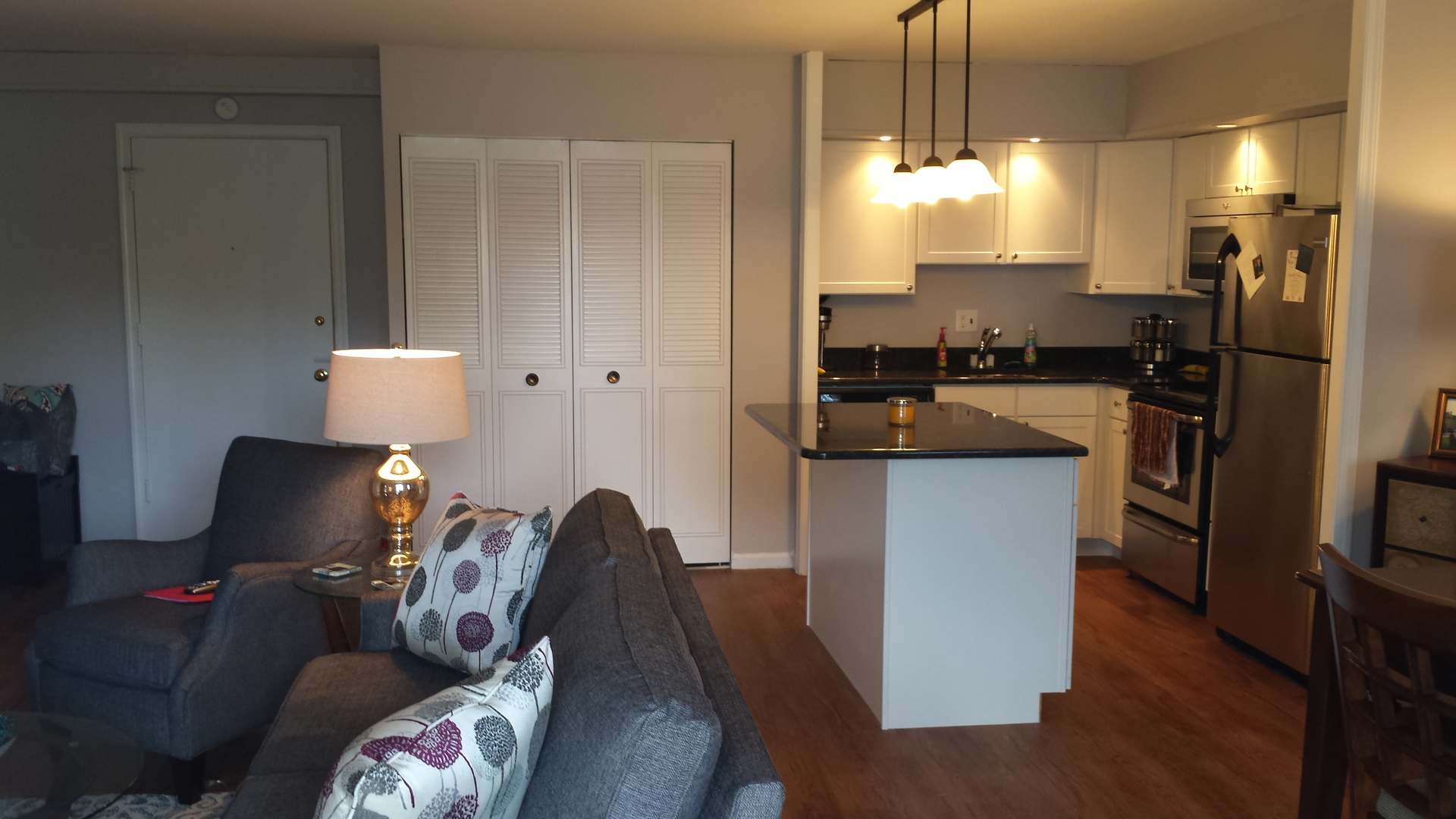 New kitchen with white shaker cabinets and steel gray granite counters. Breakfast bar. Stainless steel appliances.