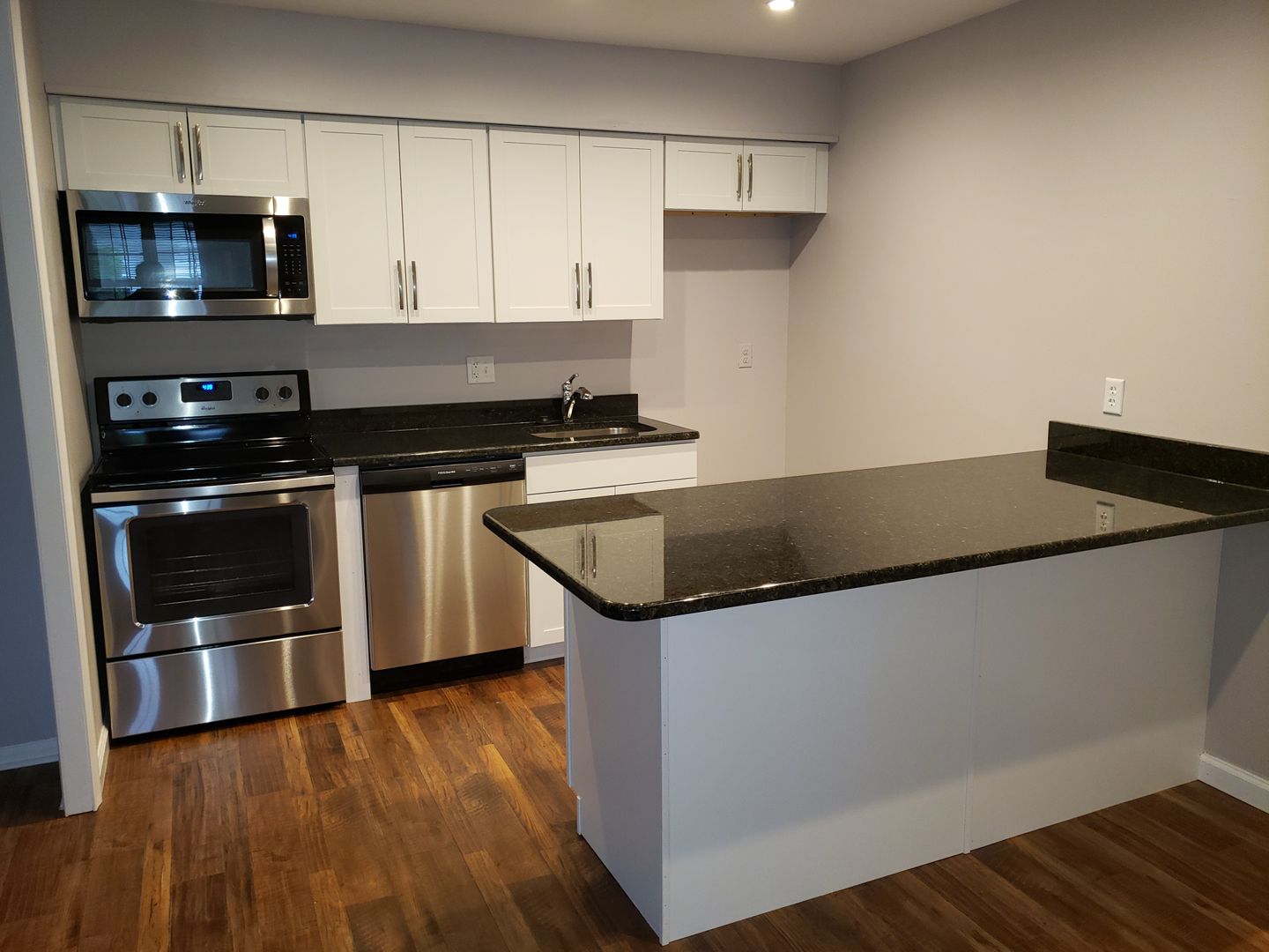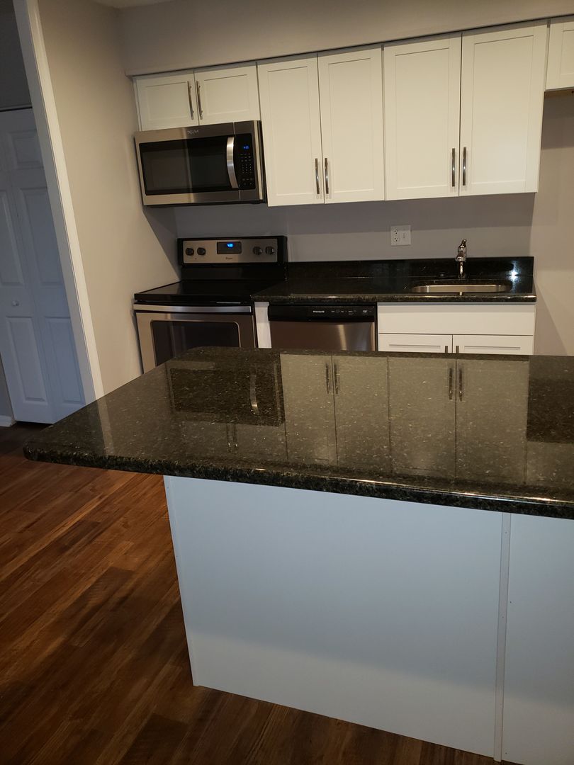New kitchen with white cabinets and granite counters. Breakfast bar. Stainless steel appliances.