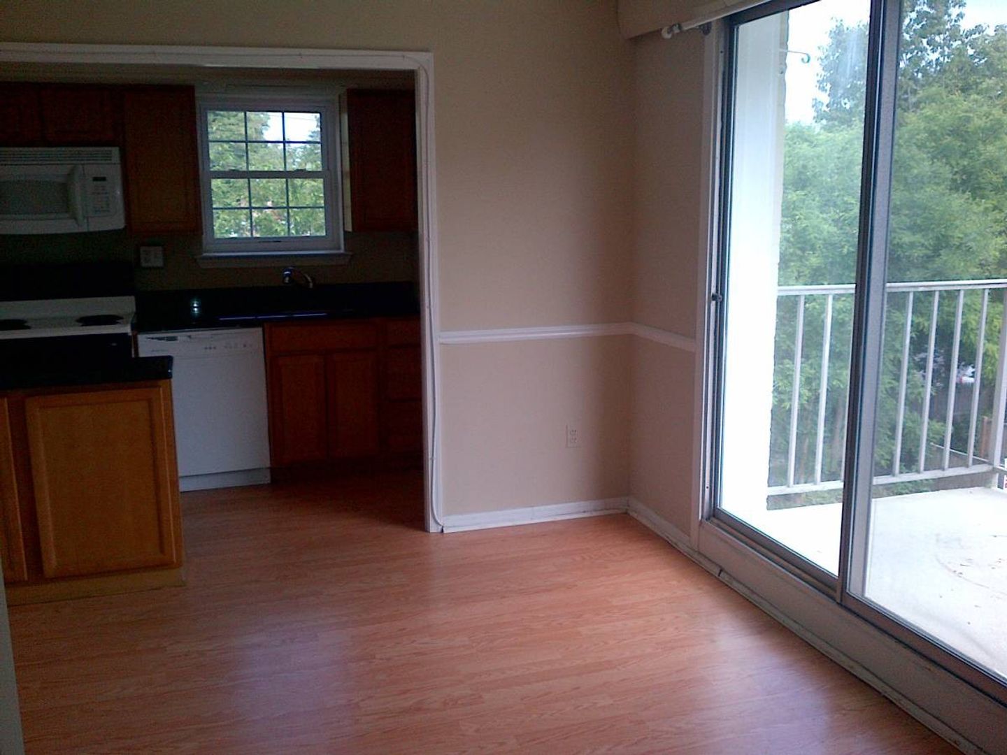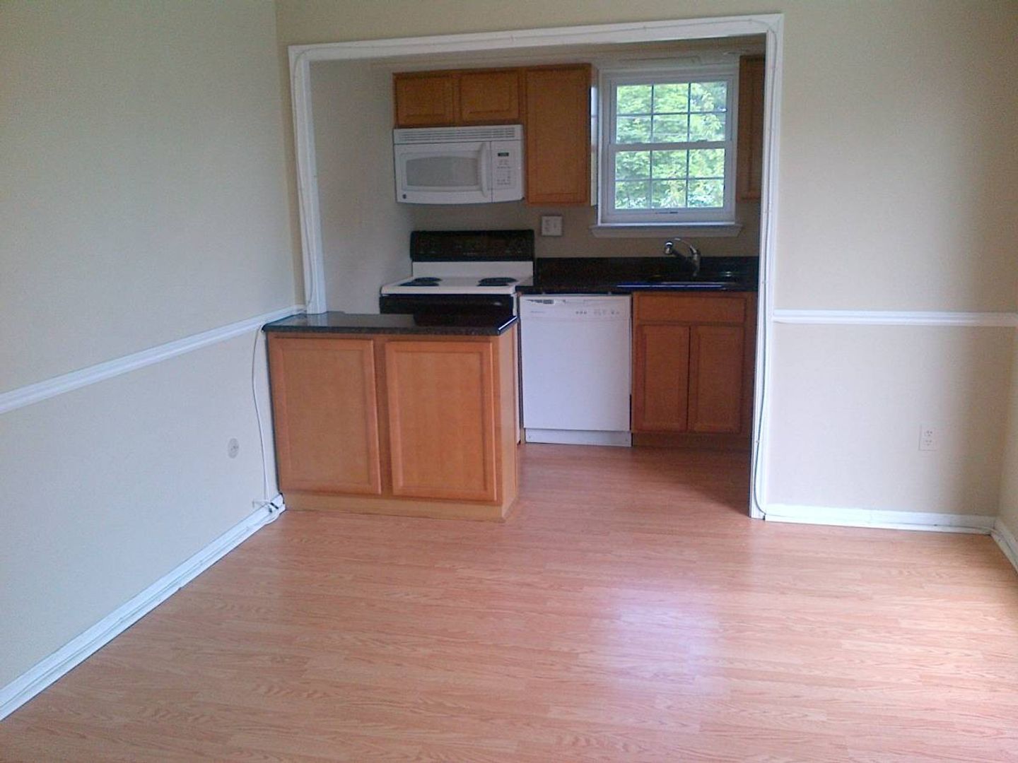 Large great room that has newer kitchen with granite countertops, dishwasher and built in microwave.