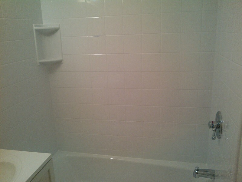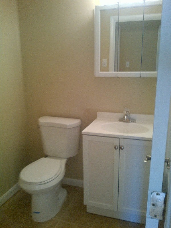 Renovated bathroom with new tile, lighting, vanity and medicine cabinet.